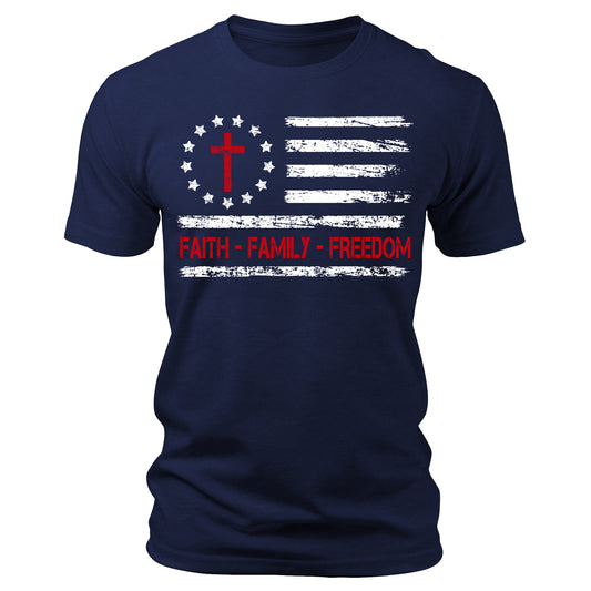 Faith Family Freedom - Patriotic Christian Vintage USA Flag T-Shirt